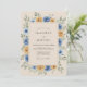 This design features a rich palette of marigold yellow and dusty blue watercolor blossoms. Lush greenery and sage-colored foliage accent the romantic arrangement against a warm sand-colored background. Beautifully detailed roses and ranunculus create a sophisticated rustic aesthetic for a seasonal event.
