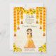 Marigold garlands cute Indian girl Haldi invitation. Yellow and orange marigolds with bells, yellow mandala background.