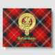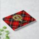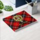 Clan Marjoribanks crest badge surrounded by a strap and buckle over tartan background. Custom front, back and spine text.