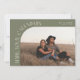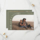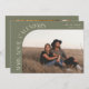 Modern and stylish save the date card featuring a text that says "mark your calendars" along the curved frame photo. One photo in the front and one on the back. The background is sage green.