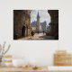 A medieval town scene features stone buildings and a central church with a tall spire, bustling with people walking along the cobblestone street. Vendors sell goods from carts, adding life and vibrancy to the historic setting.