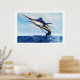 A sleek blue marlin bursts from the ocean surface in a grand leap.