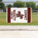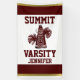 Cheerleader themed vertical banner done in white, with a gold tone and maroon stripe, on the top and bottom.  Maroon graphic artwork of a megaphone and pom poms, decorate the middle of the banner, with custom maroon text ready to personalise. Options for indoor banners or outdoor banners with grommets is available.