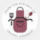 Cute kiss the cook burgundy apron "from the kitchen of" round sticker.