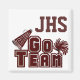 Custom maroon and silver tone school spirit magnet, with great looking graphics of maroon megaphone and a pom pom sitting on top of maroon graphic text that reads GO TEAM. Maroon text on top has high school initials and is customisable to read anything you want. Great for home or in your school locker.