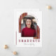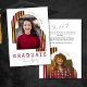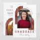 Modern Arch Photo Graduation announcement card in school colours maroon and gold. Celebrate your grad in style with these modern burgundy maroon and gold graduation announcements featuring 2 graduate photos on the front and back inside a trendy arch shape with grad name in script lettering under the words GRADUATE and class year on the front. On the back is the grad's future plans, including script "She did it"