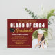 This modern maroon and gold custom senior photograph graduation party invitation features classy white typography of your college name for the class of 2025. Customise with your graduating year under the chic handwritten script and black grad cap for great invites. Add your party or ceremony details next to your graduate photo.