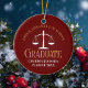 This chic maroon and gold custom law school graduation Christmas ornament features classy typography for a class of 2025 graduate. Customise with your graduating year under the white scales of justice for a great personalised lawyer or attorney gift.