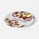 This volleyball themed birthday party paper plate is fully customisable and features clusters of maroon, gold and white volleyballs at the top and bottom edges - personalise with your custom text - by katz_d_zynes