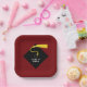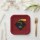 Creative graduation party or event plates for class of '25 grads featuring funny line and classic black graduation cap with gold tassel on maroon background.