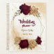 Beautiful wedding planner featuring maroon and beige gold flowers with green leaves .