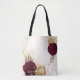 Beautiful tote bag featuring maroon and beige gold flowers with green leaves .