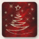 This festive and pretty holiday drink coaster features a stylised and glittery gold Christmas tree image on a deep burgundy red gradient background that almost glows with colour. Around the tree image are gold stars and snowflake images. Elegant!
