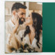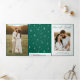 Celebrate your first Christmas as a married couple with our Married and Bright tri-fold holiday photo card! The front of the card features "Married & Bright" in a green hand-lettered modern script. Your wedding photo is displayed with a white rough edge border. Personalise the front of the card by adding a custom greeting with your names shown below. The inside of the card features two photos with space for a custom message in the middle. The outside flap features a fourth vertical photo. The outside middle of the card displays a green background with a white sparkling star pattern.