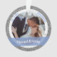 Splashy yet elegant "Married & Merry" Our First Christmas as Mr. and Mrs. [Family Name] personalised photo Christmas ornament for newlyweds, with modern cursive typography / hand lettering on a stylish semitransparent blue band, a frame of white and silver snowflakes and little stars, and another frame of simulated silver glitter. Make sure you personalise at least the two photos (front and back), the family name on the front, and the first names and the year on the back.