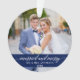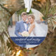 Married and Merry Elegant Calligraphy Script Wedding Photo Blue Ornament with Snowflakes back.