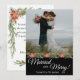 Christmas holiday photo card for newlyweds features your favourite wedding photo with "Married and Merry! in white script on top of a black background. Personalise with your names and the year beneath. On the reverse side is a sentiment for your friends and family who shared your wedding with you. It is surrounded by a lovely pine boughs, pinecones and poinsettias frame.