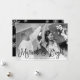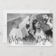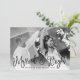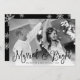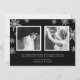 Chic holiday photo card for newlyweds features your favorite horizontal or landscape oriented wedding photo with "married and bright" overlaid in crisp black script lettering. Personalize with your names and the year beneath. Cards reverse to a snowflake background with two additional square photos and an optional custom message to your loved ones.