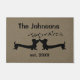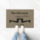 Door mat with Black Dachshund silhouettes against a canvas brown texture background. Floating hearts show the doxies in love. Customise with your name and marriage year.