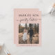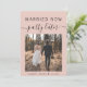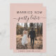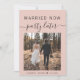 Modern elopement or smaller wedding blush pink announcement card to let family and friends know that your wedding plans changed and you eloped or reduced the number of guests at your wedding, but that you will host a celebration party in the future. The front features your photo and "Married Now, Party Later" in a mix of simple typography and trendy script. Under your photo you can add your first names and wedding date. On the reverse side you can personalize your message in more detail and your names in a signature script.