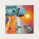 A lone astronaut stands on a rocky alien landscape, gazing up at a massive robotic structure with a clear dome and mechanical legs. Multiple planets are visible in the sky, creating a striking scene of space exploration.