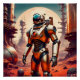 A lone astronaut stands on a rocky alien landscape, gazing up at a massive robotic structure with a clear dome and mechanical legs. Multiple planets are visible in the sky, creating a striking scene of space exploration.