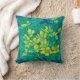 Throw pillow featuring colourful floral painting based on life sketch. Beautiful marsh marigold flower, huge burdock leaf of and dandelion buds. Colour palette: golden and lemon yellow, turquoise, teal, green and blue colours. acrylic on paper, 2022