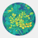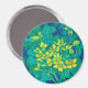 Round mmagnet featuring colorful floral painting based on life sketch. Beautiful marsh marigold flower, huge burdock leaf of and dandelion buds. Color palette: golden and lemon yellow, turquoise, teal, green and blue colors. acrylic on paper, 2022
