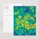 Postcard featuring colourful floral painting based on life sketch. Beautiful marsh marigold flower, huge burdock leaf of and dandelion buds. Colour palette: golden and lemon yellow, turquoise, teal, green and blue colours. acrylic on paper, 2022