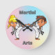 Cute pastel background, says Martial Arts and has a girl and boy doing their best karate kick!