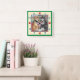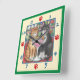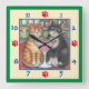 Cats Bud & Tony share a giant pink martini with bar drinks in the background. This whimsical illustration is bordered with a neutral butter yellow & green edged border. North/South and East/West time indicators are their trademark paw prints in red, while all others are blue easy to read numbers. A purrfectly fun wall piece for a kitchen or bar combination and designed to appeal to all cat lovers. Illustration has a subtle paw print painted in the design, see if you can find it.