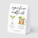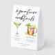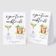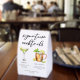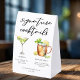 This chic signature cocktails table tent sign features simple black typography above 2 drinks and their ingredients for your wedding bar. A cute Martini and Moscow mule drawing add a cool flair to your bar menu. Complete with the couple's names and date for their reception.