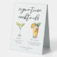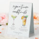 This chic signature cocktails table tent sign features simple black typography above 2 drinks and their ingredients for your wedding bar. A cute Martini and Piña Colada drawing add a cool flair to your bar menu. Complete with the couple's names and date for their reception.