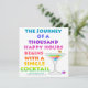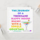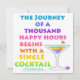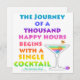 "The journey of a thousand happy hours begins with a single cocktail." ~ The Martini Diva Illustrated with a rainbow martini and four colourful olives.