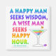 "A Happy Man Seeks Wisdom, A Wise Man Seeks Happy Hour." ~ The Martini Diva Illustrated with a rainbow martini and four colourful olives.