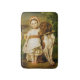 This design features a painting by the British symbolist artist George Frederick Watts (1817–1904). It is a portrait of a young girl named Mary Fox dressed up in her finest clothes: she is wearing a white dress with a red hat and red shoes. The girl has her arm around her pet dog, which is a Spanish pointer. The dog and the girl are standing in a rural landscape with some green rolling hills and trees in the background. There is a sunset in the sky. The original artwork was painted by G.F. Watts in 1854.