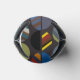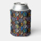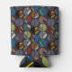 This can cooler has a mid-century modern design of oval halves, some solid and some striped, in masculine colours on a field of dark grey.