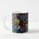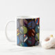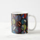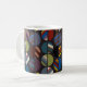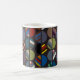 This mug has a mid-century modern design of oval halves, some solid and some striped, in masculine colours on a field of dark grey.