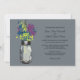 Perfect for a country style wedding or maybe you just love Mason Jars! Mason Jar hanging on a hook filled with country wildflowers. A Chic Grey background against the hanging Mason Jar and wildflowers in colours of Navy, Eggplant and Chartreuse. If you have any questions on this design or want a colour change please email me paula@labellarue.com Also check for the RSVP, RECEPTION and GUEST SEATING Cards to match!