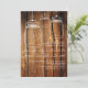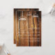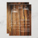 A simple rustic country wedding invitation with a distressed barn wood print background and mason jars hanging from the top of the invitation.