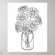 Stylised black and white illustration of a mason jar with large daisy like flowers. Made for easy colouring.