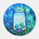 A mason jar of glowing fireflies or lightning bugs against a starry night background. An elegnt country rustic design. In colours of blue, green and yellow.