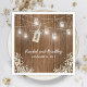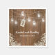 COUNTRY CHIC WEDDING NAPKINS | Rustic barn wood background, string twinkle mason jar lights, a babys breath floral corner decor, a tag tied with a knot featuring your initials and a simple wedding template.