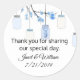 Pretty round wedding favour sticker done in white, with graphics of white and blue mason jars, hanging off a blue coloured blossoming tree limb. Personalise the text for your wedding. Matching products are available.