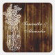 Adorable square shaped envelope seal or sticker for wedding guest favours.  Mason jar stamped image in white, on a dark brown wood plank background image (not real wood).  A semi grungy outdoor theme for a country summer or cabin wedding.  THE dark chocolate brown wooden boards from an antique fence or floorboards contrast against a white cutout stamped outline image of a mason jar with baby's breath and other lacy wildflowers. All Designs Copyright © www.CustomInvitesOnline.com