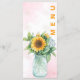 Bring rustic charm to your reception tables with this beautifully designed wedding menu card featuring a vibrant sunflower bouquet in a watercolor mason jar illustration. Perfect for barn, country, farmhouse, or garden-themed weddings, this vertical menu card showcases a clean and elegant layout with bold yellow typography for the "Menu" heading and delicate script for your meal details. The back includes customised sections for starters, main course, and dessert, giving guests a preview of your delicious celebration. Easily personalise the text to suit your wedding meal and create a cohesive look with matching sunflower wedding stationery.