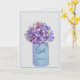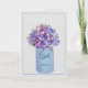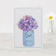 Ball Mason Jar filled with beautiful purple blue hydrangea flowers. Twinkling string lights hang overhead.