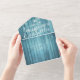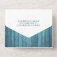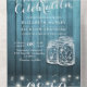 Modern Wedding invitation with Detachable RSVP Postcard Template - Elegant Lettering Script and Vintage Couple Mason Jars and String Lights on Blue Rustic Wood Background.