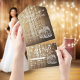 Modern Wedding invitation with Detachable RSVP Postcard Template - Elegant Lettering Script and Vintage Couple Mason Jars and String Lights on Rustic Wood Background.