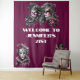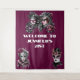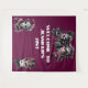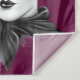 A fabulous Venetian masked ball wall hanging features vibrant and eye-catching watercolor ai graphics of men and women wearing opulent and ornate face masks in shades of dark plum, burgundy, grey and black. Their masks are adorned with ornate filigree etchings, feathers and floral flowers. Each mask is unique and both the men and woman have porcelain white skin and dark ruby red lips. They are set against a fuchsia coloured background that makes them pop. Personalise the large, bold text templates to suit your special masquerade carnival wedding or festival birthday party / business event.